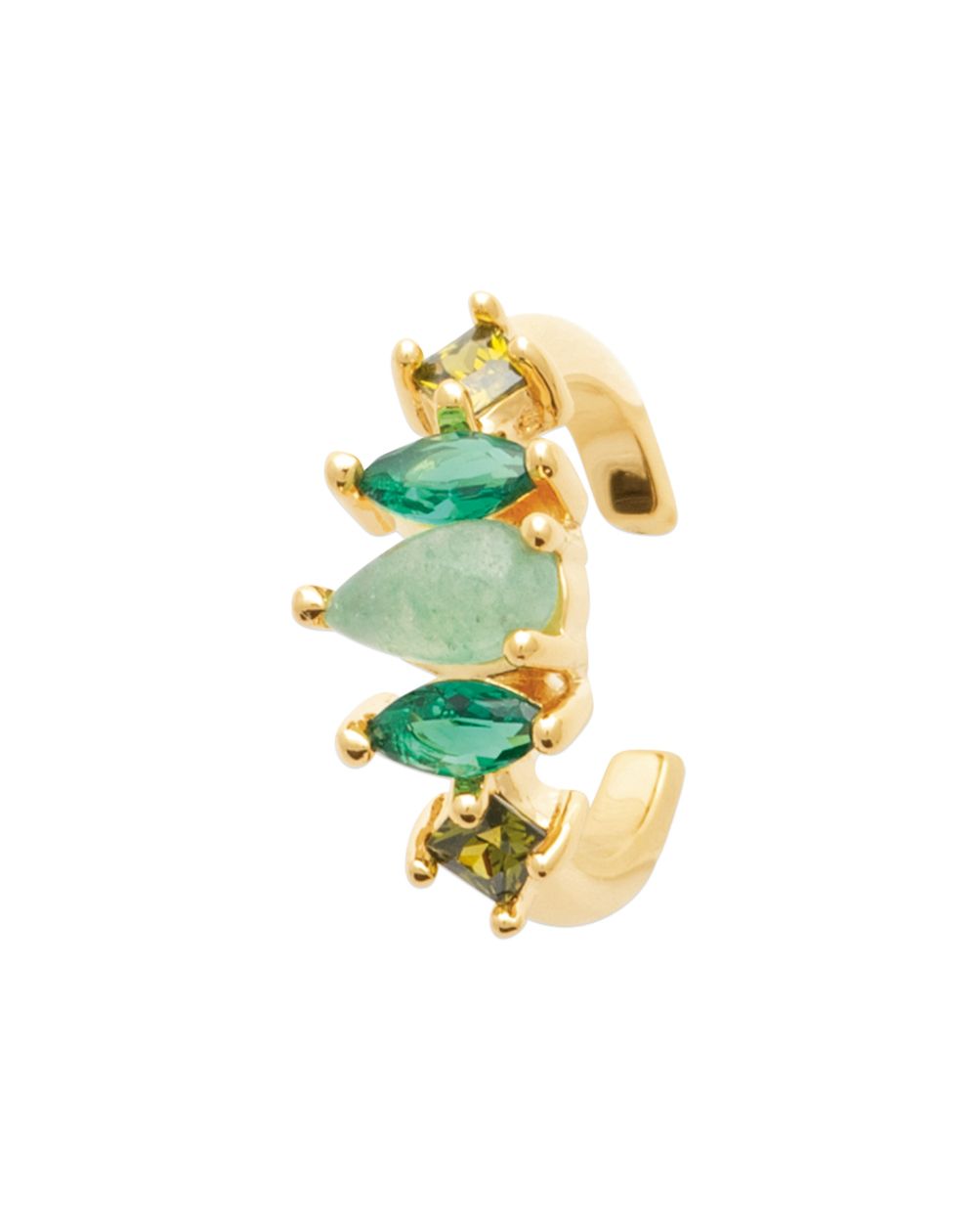 Vergulde oorbel, versierd met trapsgewijze groene stenen, modern en kleurrijk design.