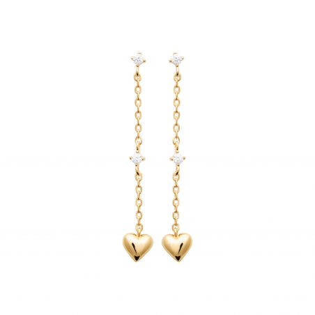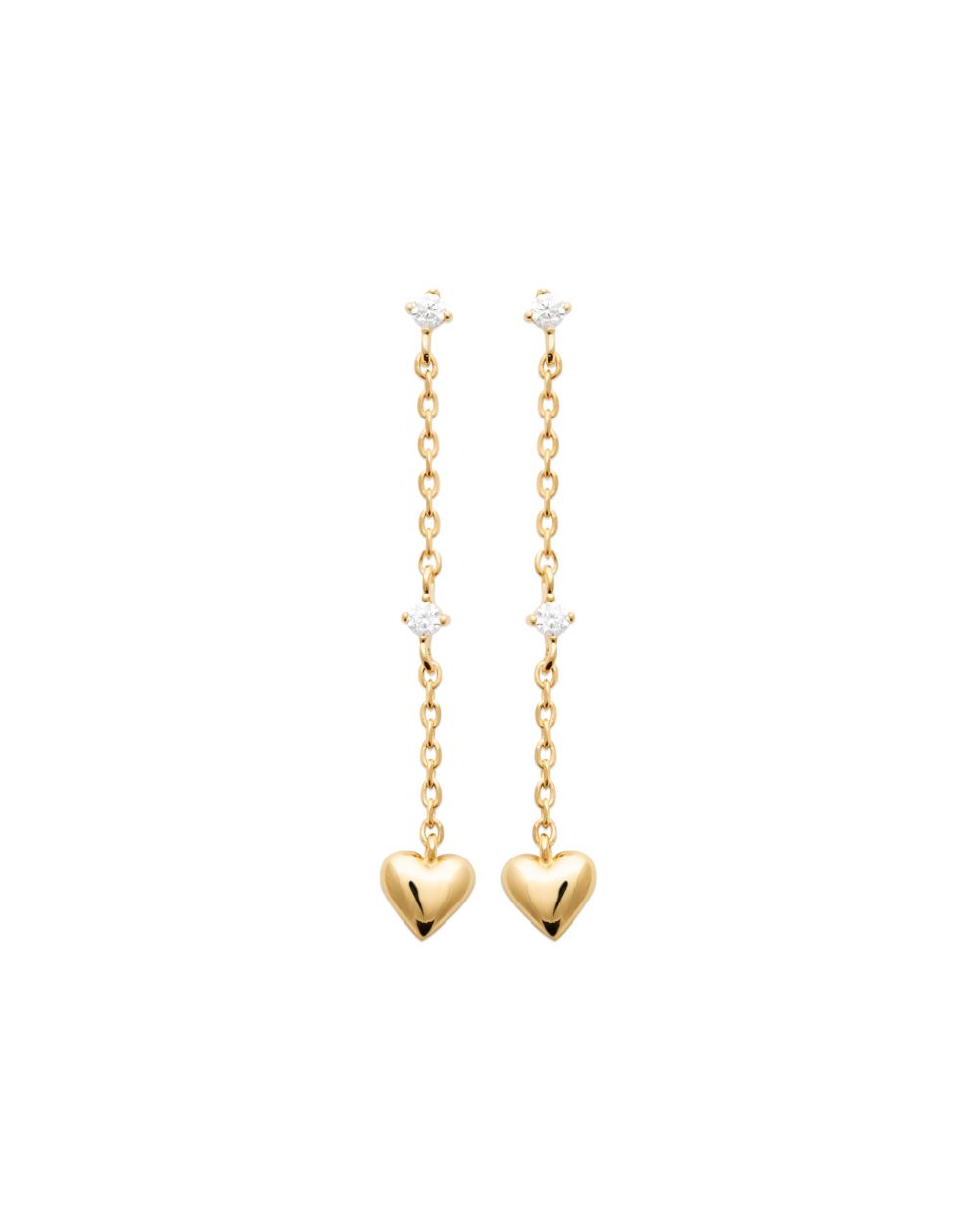 Deze oorbellen zijn elegant ontworpen in verguld goud. Elke oorbel is voorzien van een delicate goudkleurige ketting die twee glanzende zirkoniastenen met elkaar verbindt, die op gelijkmatige afstanden zijn gerangschikt. Aan het uiteinde van elke ketting hangt een charmant klein gepolijst gouden hart, wat een vleugje romantiek aan het ontwerp toevoegt. De combinatie van de schittering van de stenen met de zachtheid van de gouden harten zorgt voor een moderne en toch klassieke look, perfect voor verschillende gelegenheden, van formeel tot casual.