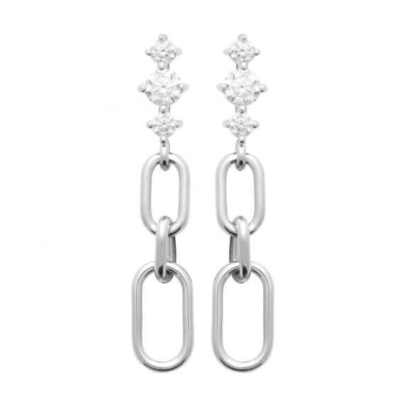 Dit paar mesh-oorbellen in gerhodineerd 925 zilver combineert elegantie en moderniteit dankzij hun gedurfde ontwerp. Ze zijn gemaakt van met elkaar verweven zilveren schakels en zorgen voor een eigentijdse en minimalistische uitstraling. Het bovenste gedeelte wordt versterkt door sprankelende zirkoniumoxidestenen, die het licht opvangen en een vleugje verfijning toevoegen.