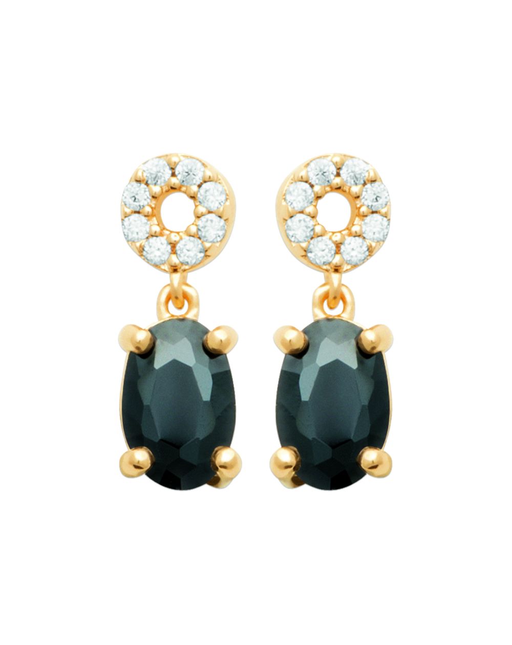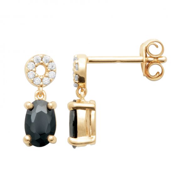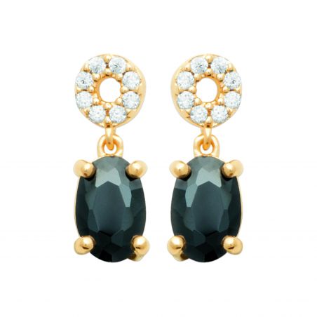 Deze oorbellen zijn elegant en verfijnd, ontworpen om een vleugje verfijning aan elke outfit te geven. Ze zijn voorzien van een zwarte steen die in een ovale vorm is gesneden en prachtig is geplaatst in een delicate omgeving. Deze steen wordt vergezeld door een bovenste cirkel versierd met kleine zirkoniasteentjes, die voor een subtiele glans en elegant contrast zorgen met de centrale zwarte steen. Het geheel is gemonteerd op een 18k vergulde metalen basis, wat een luxe en tijdloze afwerking biedt.