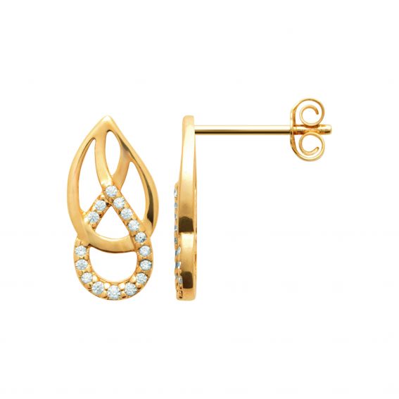 Deze vergulde oorbellen hebben een elegant en verfijnd ontwerp, geïnspireerd op een verweven vorm die doet denken aan delicate arabesken. Ze zijn bezet met kleine fonkelende steentjes die hun glans en verfijning versterken. Ze zijn licht en vrouwelijk en zorgen voor een subtiele glamoureuze touch. Ze zijn perfect om een avondoutfit te verfraaien of om een chique tintje toe te voegen aan het dagelijks leven.