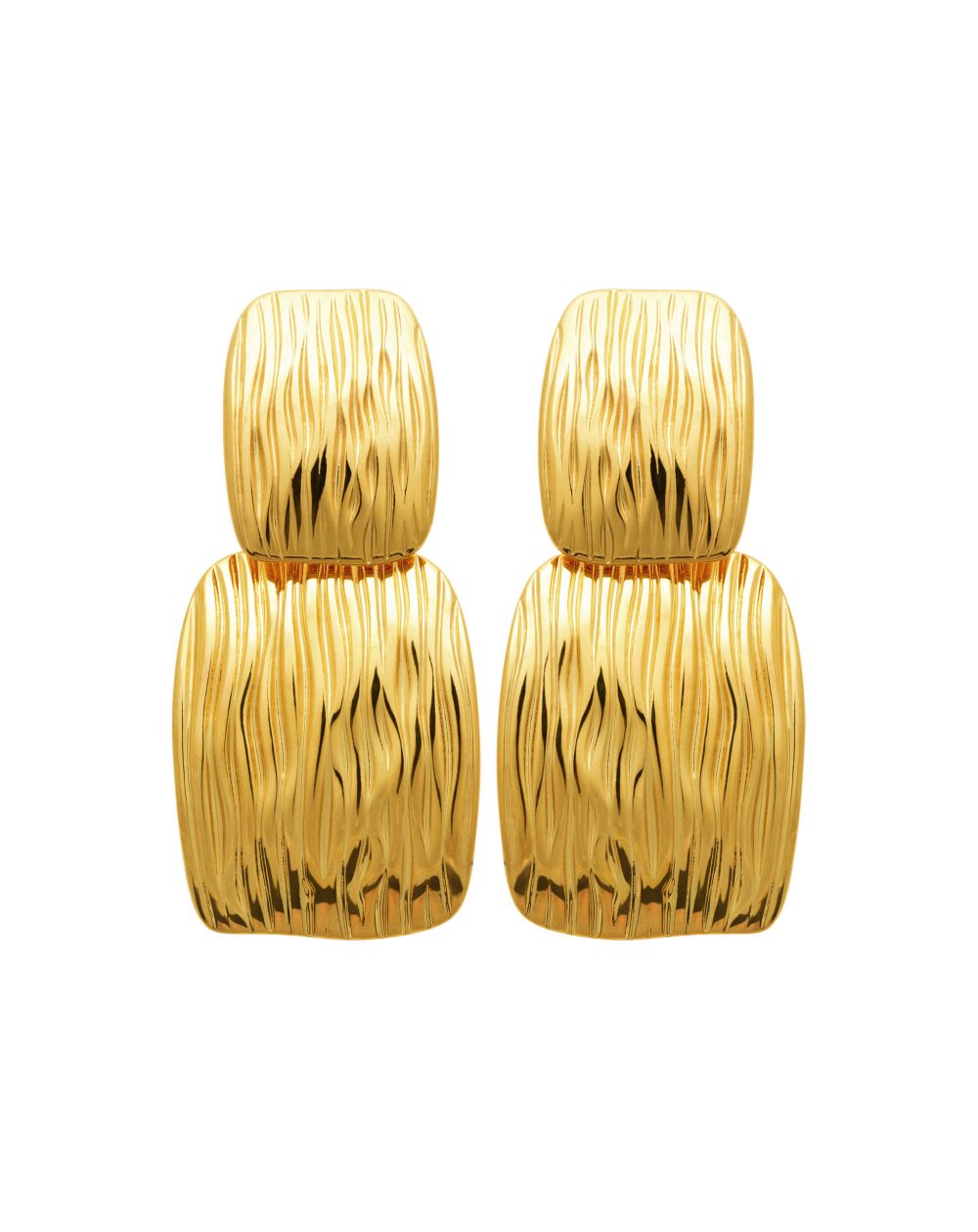 Deze goudkleurige oorbellen van roestvrij staal hebben een textuur die doet denken aan organische golven. Ze bestaan uit twee gearticuleerde elementen en combineren moderniteit en verfijning voor een gedurfd maar verfijnd effect. Hun glanzende afwerking maakt ze tot een elegant accessoire, perfect om een formele outfit te accentueren of een vleugje karakter toe te voegen aan een alledaagse look.
