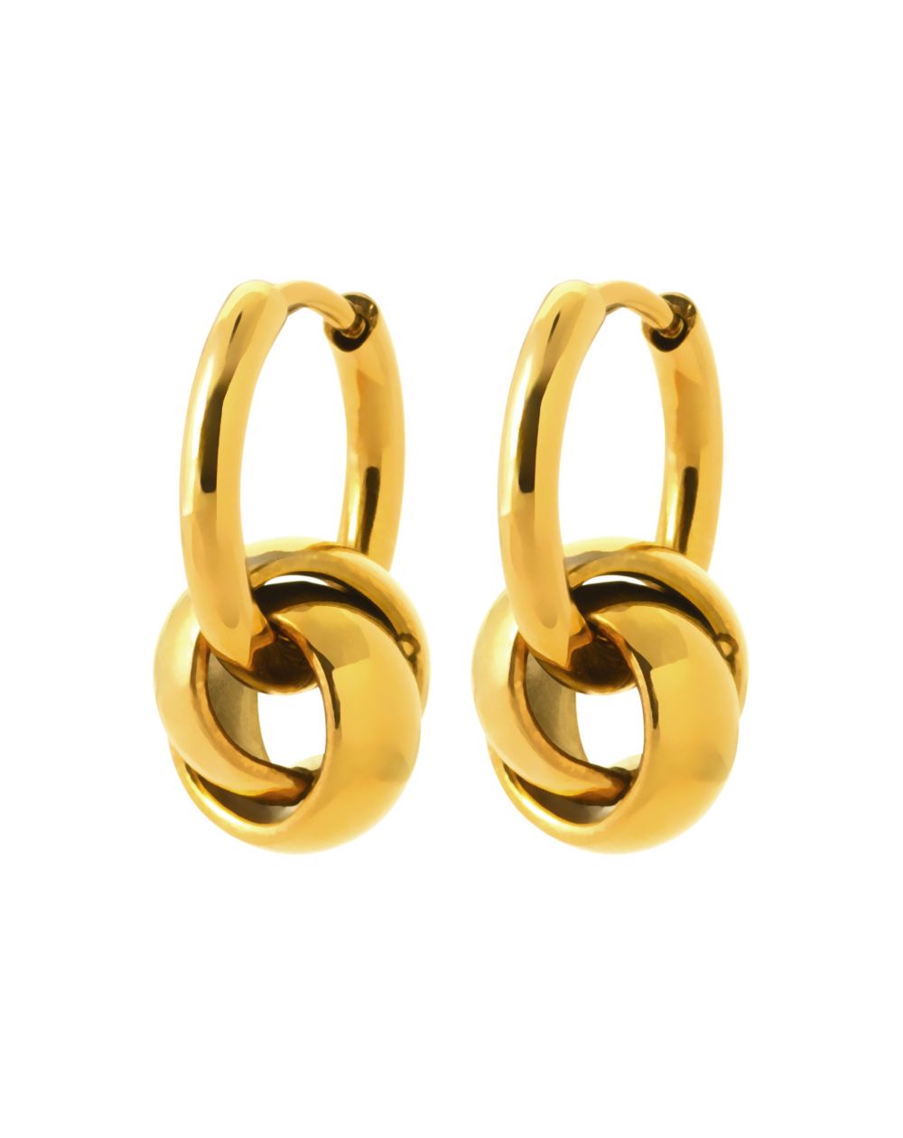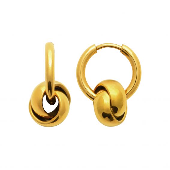 Deze gouden stalen creolen hebben een geraffineerd design met een hanger met een verweven knoop. De glanzende afwerking en het strakke silhouet geven elke outfit een moderne, tijdloze touch. Ze zijn licht en gemakkelijk te dragen en sluiten met een praktisch scharniersysteem, wat comfort en optimale ondersteuning garandeert. Ideaal voor een verfijnde dagelijkse look of voor een speciale gelegenheid.