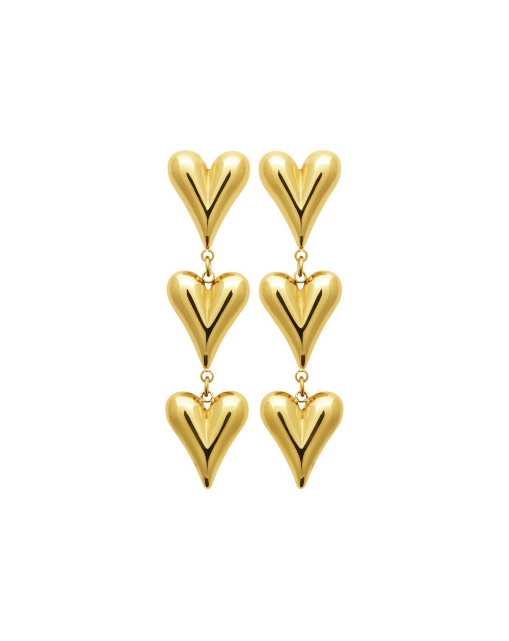 Deze oorbellen van goudkleurig staal zijn versierd met een waterval van volumineuze, glanzende harten, wat een dramatisch en romantisch effect creëert. Het gearticuleerde ontwerp brengt beweging en verrijkt elke outfit met gedurfdheid en elegantie. Een sterk stuk, perfect voor wie zijn stijl graag op een originele manier wil benadrukken.