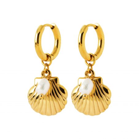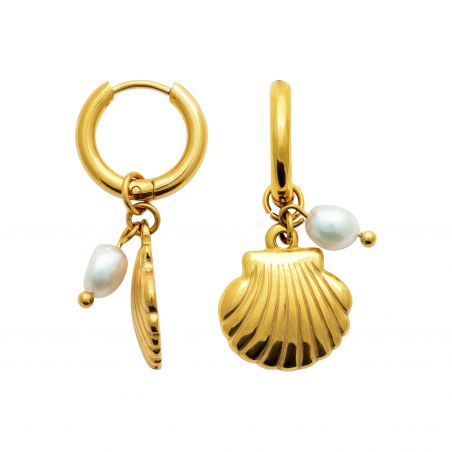 Nerida- oorbellen vieren de zachtheid van de oceaan en de schoonheid van natuurlijke schatten. Ze hebben de vorm van ingewikkeld gebeeldhouwde sint-jakobsschelpen en worden geaccentueerd door een onregelmatige witte parel, die doet denken aan een druppel kostbaar schuim. Gemonteerd op vergulde roestvrijstalen ringen, bieden ze een zonnige glans en een uitgesproken zomers gevoel.