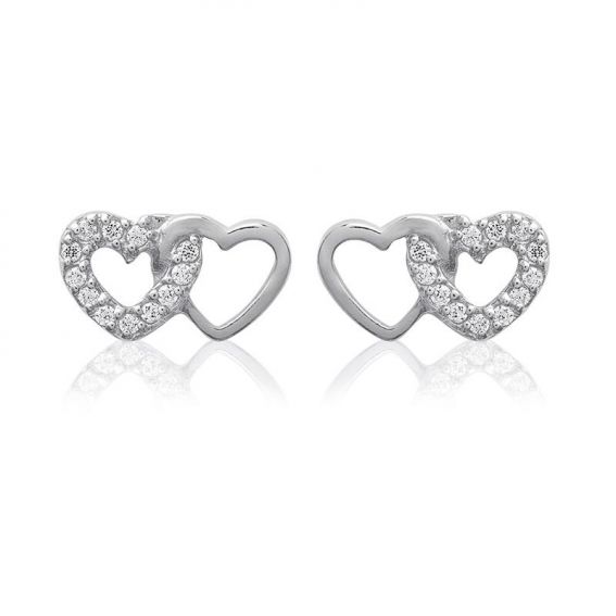 Deze oorbellen van 925 zilver zijn voorzien van twee in elkaar verweven harten, één glad en de ander bezet met sprankelende zirkonen. Een subtiel symbool van liefde en verbondenheid, met een verfijnd ontwerp dat elke outfit een vleugje romantiek geeft.