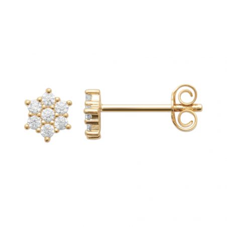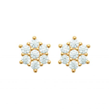 Deze schitterende en delicate oorbellen van 18-karaats verguld goud zijn voorzien van een pavézetting van zorgvuldig gezette zirkonia's die de schittering van diamanten nabootsen. Het glinsterende bloemmotief zorgt voor een verfijnde en tijdloze look, ideaal om het gezicht elegant te verlichten.