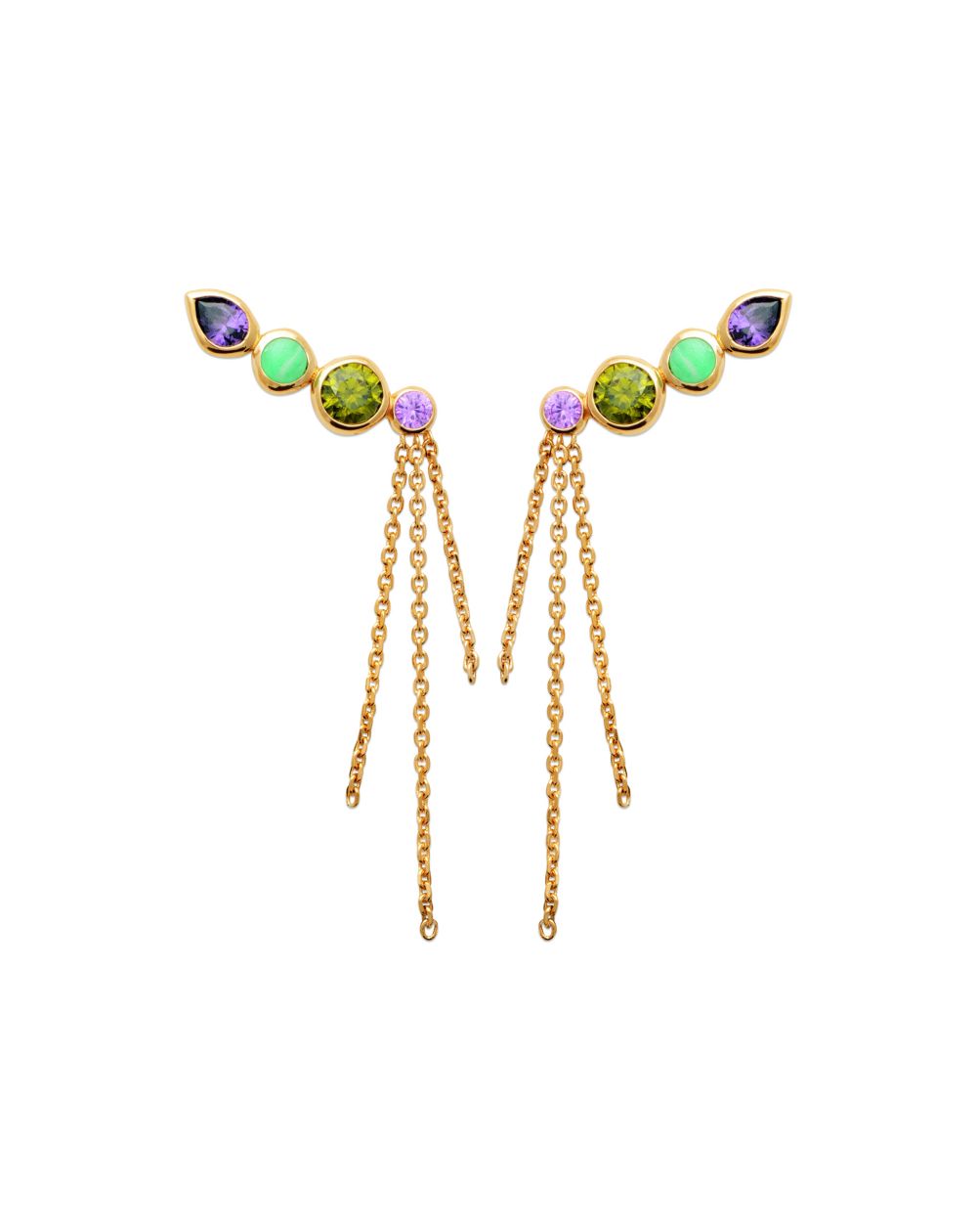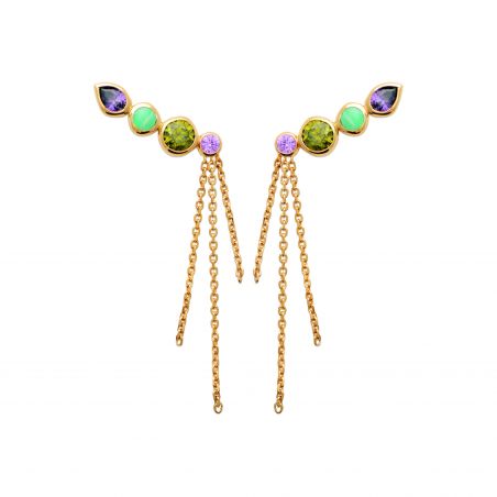 Omarm kleur en licht met de Stardust Éclat oorbellen: oorbellen van 18-karaats verguld goud, geaccentueerd door een gradiënt van levendige stenen die het gezicht direct verlichten. De delicate kettingen zorgen voor een onweerstaanbaar glamoureus cascade-effect. Een gedurfd en elegant sieraad, perfect om een statement te maken. 10 jaar garantie op de plating.