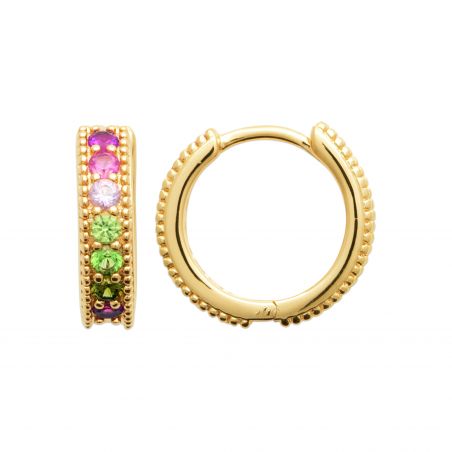 Stralend en verfijnd, de Rainbow Luxe creolen fleuren je look direct op. Gemaakt van 18-karaats goud met 10 jaar garantie op de plating, vallen ze op door hun prachtige rij veelkleurige stenen: roze, paars en groen, voor een vrolijk en ultratrendy effect.
