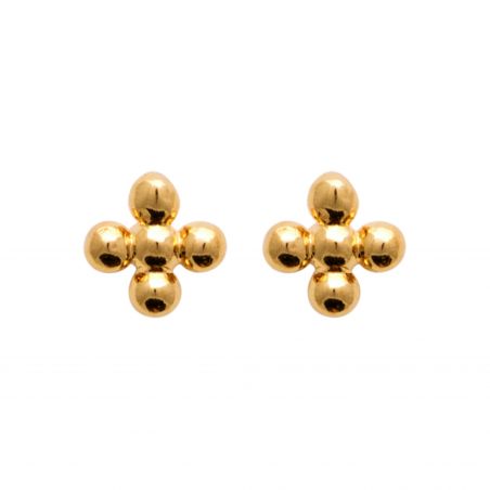 Deze vergulde oorknopjes hebben een subtiel kruisje van gladde parels , wat een grafisch en minimalistisch effect creëert. Het lichte volume vangt het licht op een zachte manier en zorgt voor een warme, ingetogen gloed.