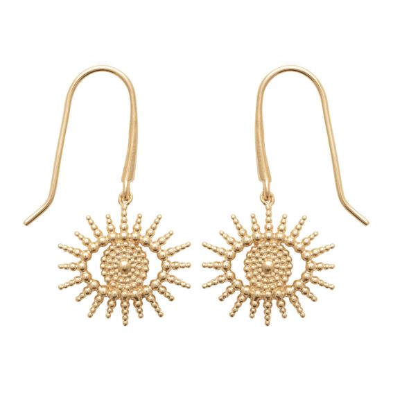 De 18-karaats vergulde zetting zorgt voor een warme, blijvende glans en accentueert de details van de zonhanger. Dankzij de haaksluiting zijn deze oorbellen licht, comfortabel en prettig om elke dag te dragen, terwijl ze tegelijkertijd een vleugje natuurlijke elegantie aan het gezicht toevoegen.