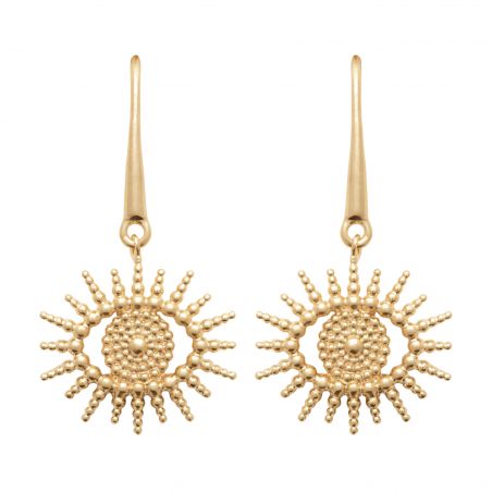 Deze 18-karaats vergulde oorbellen met zonmotief voor dames , uit de Solaris-collectie , vangen de essentie van licht en zonne-energie. Het zonvormige motief, verfijnd vervaardigd met kralenreliëfs, voegt een stralende en symbolische toets toe aan elke beweging.