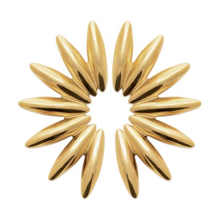 Maak een statement met de Radiant Sun oorbellen van verguld roestvrij staal , een sculpturaal sieraad met een ontwerp geïnspireerd op zonnestralen. De waaiervorm, bestaande uit langwerpige en glinsterende bloemblaadjes, creëert een krachtig en elegant lichteffect rond het gezicht.