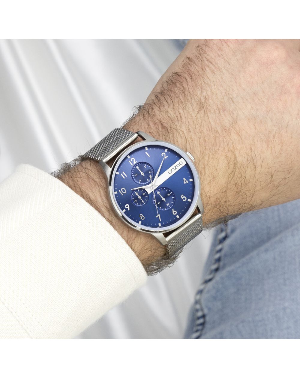 Val op met dit prachtige ronde design voor heren uit de trendy OOZOO Timepieces collectie. De C11300 heeft een zilverkleurige metalen mesh-band en een zilverkleurige metalen horlogekast van 45 mm. Met deze blauwe wijzerplaat, zilveren cijfers en zilver/witte wijzers maak je een fashion statement. Dit garderobe-essentiële horloge heeft een kast van mineraalglas en metaal met coating. Dit ontwerp heeft een roestvrijstalen achterplaat en is nikkelveilig. Dit horloge heeft een Japans 2ATM uurwerk en wordt gedekt door een garantie van 2 jaar