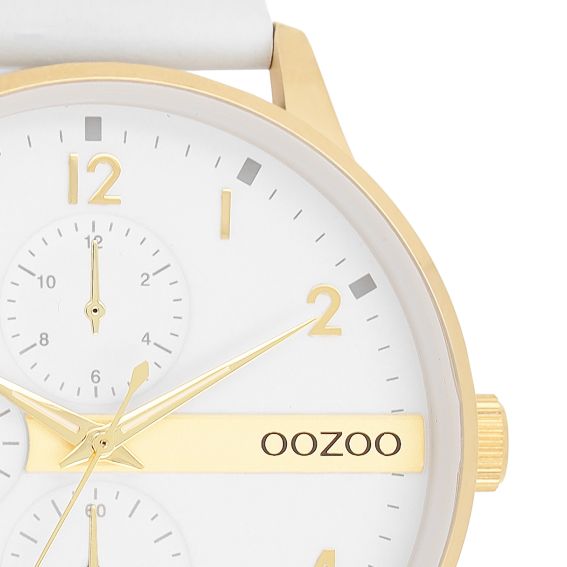 Val op met dit prachtige ronde design voor heren uit de trendy OOZOO Timepieces collectie. De C11305 heeft een wit gestikte leren band en een goudkleurige metalen horlogekast van 45 mm. Met deze witte staafwijzerplaat, gouden cijfers en goud/witte wijzers maak je een fashion statement. Dit garderobe-essentiële horloge is voorzien van mineraalglas en een metalen kast met coating. Dit ontwerp heeft een roestvrijstalen achterplaat en is nikkelveilig. Dit horloge heeft een Japans 2ATM uurwerk en wordt gedekt door een garantie van 2 jaar.