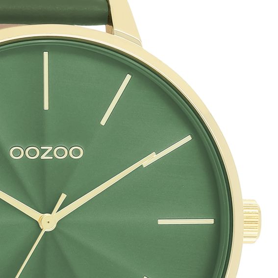 Val op met dit prachtige ronde design voor dames uit de trendy OOZOO Timepieces horlogecollectie. Model C11349 heeft een groene leren band en een goudkleurige metalen horlogekast van 48 mm. Bevestig uw stijl met elegantie dankzij deze groene sunburst wijzerplaat, de goudgestreepte cijfers en bijpassende wijzers. Dit essentiële horloge voor je garderobe is uitgerust met mineraalglas en een metalen kast met een coating, wat duurzaamheid en weerstand garandeert. De roestvrijstalen achterkant garandeert optimale veiligheid tegen nikkel. Met zijn Japanse 2ATM-uurwerk biedt dit horloge keer op keer betrouwbare precisie, terwijl de garantie van 2 jaar u extra gemoedsrust geeft. Kies voor tijdloze elegantie en kwaliteit met de C11349 van OOZOO Timepieces.