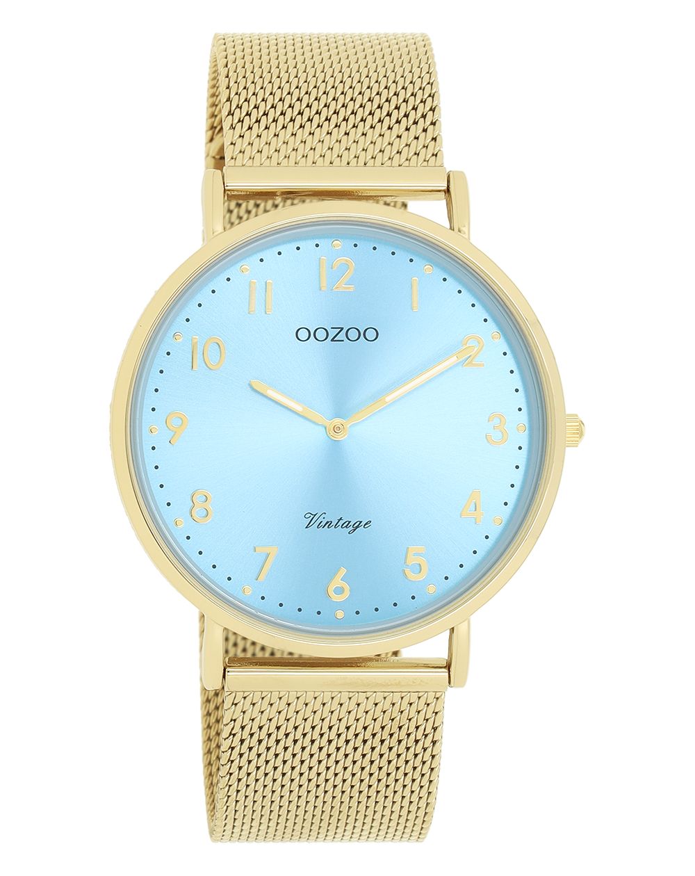Klassieke charme blijft essentieel in deze trendy serie en daarom is dit ronde vintage design van OOZOO, verfraaid met een speelse knipoog, de musthave van het seizoen! Dit unisex-horloge belichaamt perfect de elegante combinatie van mode en comfort, met een goudkleurige metalen horlogekast van 40 mm en een lichtblauwe sunray-wijzerplaat. De goudkleurige metalen mesh-armband geeft dit horloge een vleugje verfijning, waardoor het een trendy accessoire is dat je elke dag kunt dragen. De wijzerplaat is verfraaid met gouden stippen en cijfers, vergezeld van bijpassende wijzers. Model C20343 geeft een sprankelende glans aan je outfit. Het mineraalglas is gehuisvest in een slanke metalen horlogekast van 6,9 mm, versierd met goudplating. Dit ontwerp is voorzien van een roestvrijstalen achterplaat en is gegarandeerd nikkelvrij. Dit horloge wordt aangedreven door een Japans 2ATM-uurwerk.