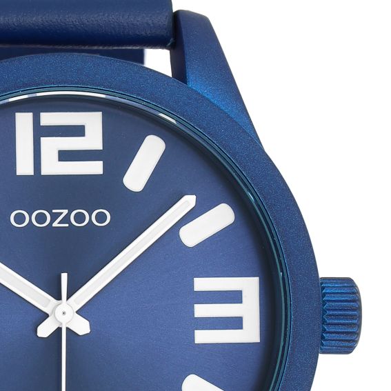 Het Oozoo C1092 horloge heeft een kast met een diameter van 46 mm en een blauwe matte afwerking. Het beschikt over een wijzerplaat met grote witte cijfers voor optimale leesbaarheid. Met zijn bijpassende leren band en decoratieve klinknagels is hij waterbestendig tot 2 ATM.