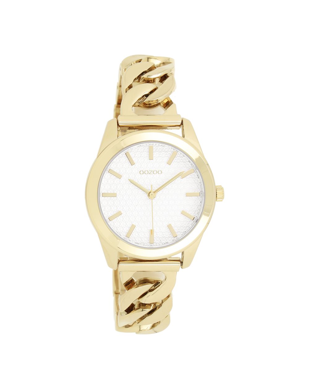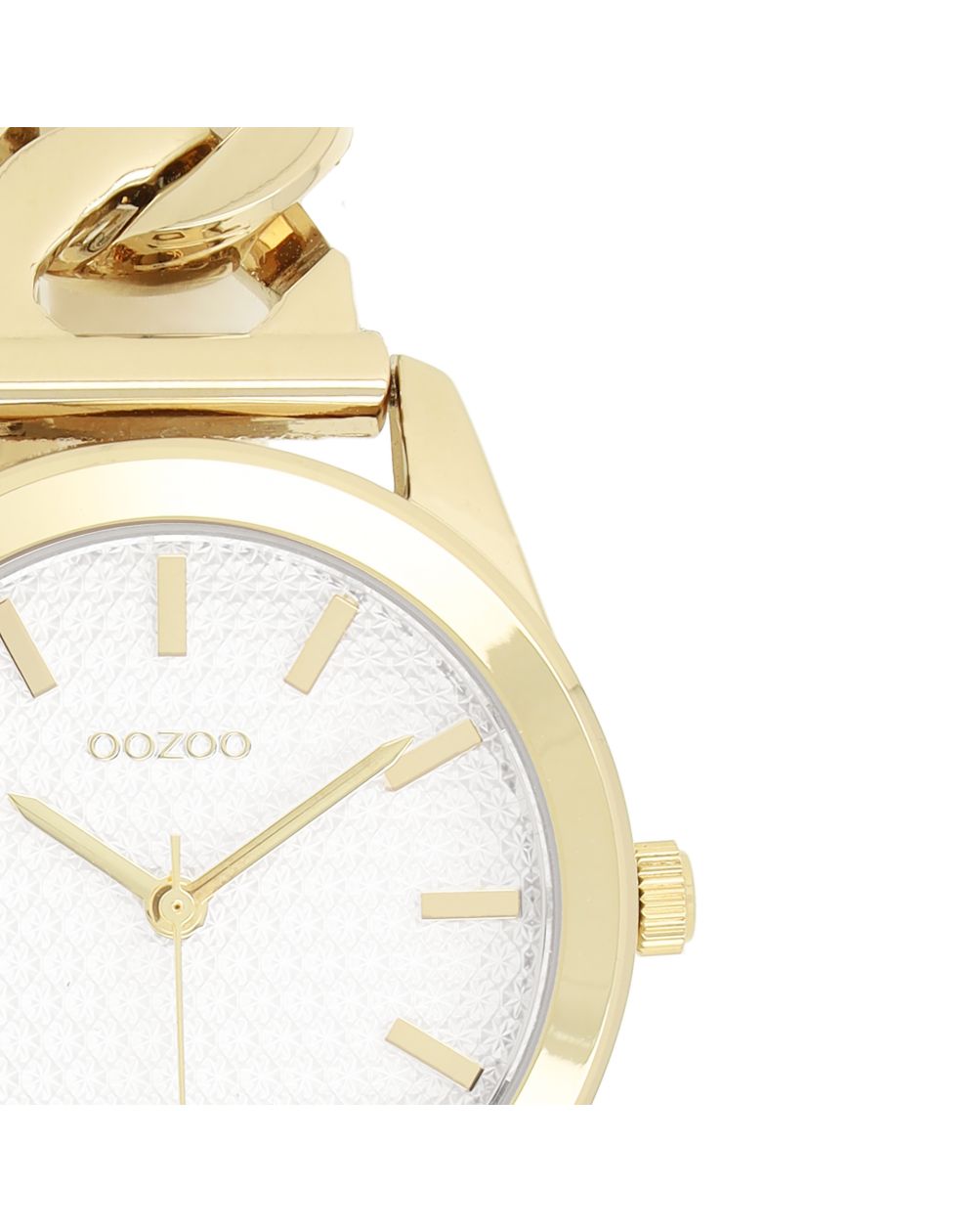 Dit dameshorloge onderscheidt zich door een armband met een kleine zilveren ketting en een gouden metalen kast van 32 mm. De witte wijzerplaat met patroon, met gestreepte zilveren indexen en bijpassende wijzers, voegt een verfijnde toets toe. Voorzien van mineraalglas, nikkelvrije RVS achterkant en Japans 2ATM uurwerk.
