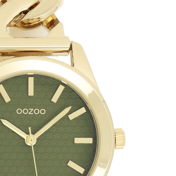Dit Oozoo C11421 gouden horloge met olijfgroene achtergrond voor dames heeft een kleine schakelarmband en een gouden metalen kast van 32 mm. De wijzerplaat met patroon, met gestreepte indexen en bijpassende wijzers, voegt een verfijnde toets toe. Voorzien van mineraalglas, nikkelvrije RVS achterkant en Japans 2ATM uurwerk.
