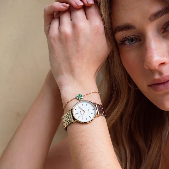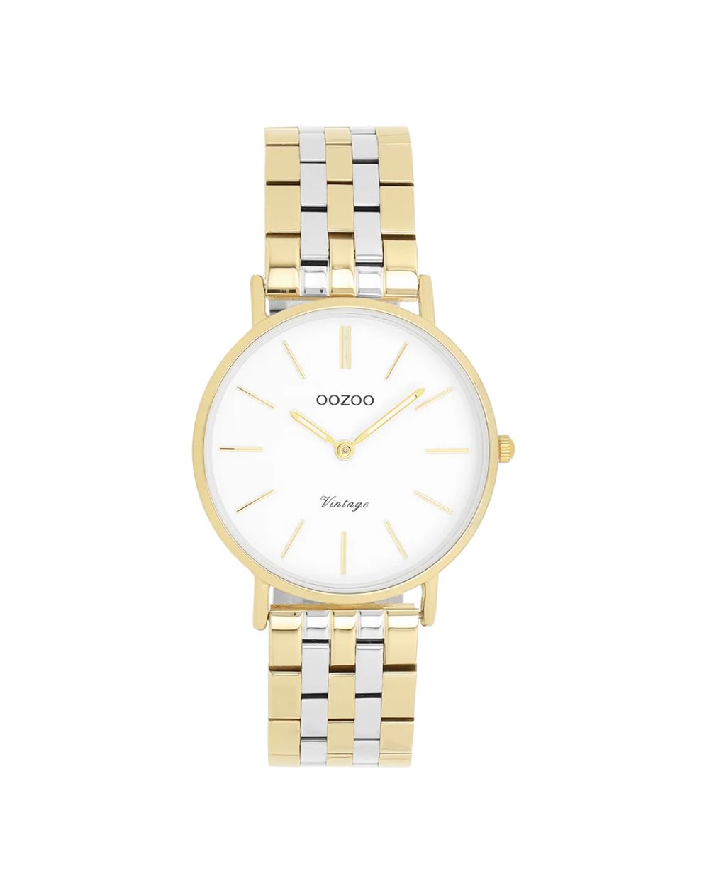 Dit elegante en tijdloze OOZOO horloge heeft een strakke witte wijzerplaat met verfijnde gouden details. De armband van roestvrij staal in goud en zilver heeft een chique en moderne stijl en is geschikt voor alle gelegenheden.