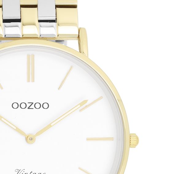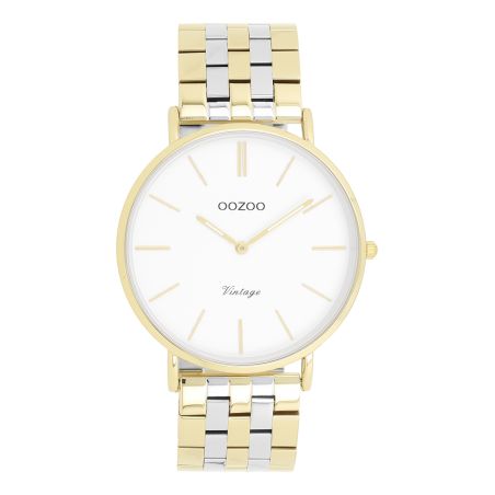 De ronde, goudkleurige metalen kast is 40 mm groot en de strakke, witte wijzerplaat is een echte blikvanger, perfect voor een heldere en verfijnde look. De tweekleurige roestvrijstalen armband, waarin zilver en goud zijn gecombineerd, geeft het horloge een moderne en gedurfde uitstraling, ideaal om al uw dagelijkse outfits mee te verfraaien.