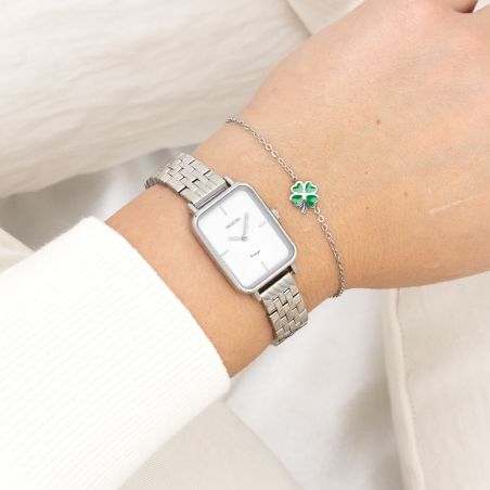 Dit uniseks en gemakkelijk te dragen horloge biedt de perfecte balans tussen verfijning en comfort. De glanzende, zilverkleurige roestvrijstalen armband accentueert de chique en moderne uitstraling, waardoor dit sieraad een onmisbaar accessoire voor elke dag is.