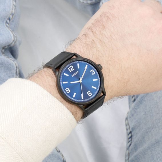 Laat een zelfverzekerde look zien met het OOZOO Timepieces C11502 unisex horloge , een opvallend model dat een stedelijke stijl en verfijnde elegantie combineert. De zorgvuldig afgewerkte , gestikte zwarte leren band past perfect bij de 45 mm zwarte metalen kast en vormt een opvallend contrast met de gepatternde blauwe wijzerplaat .