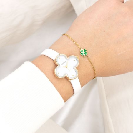 Bevestig uw vrouwelijkheid met finesse dankzij het OOZOO Timepieces C11520 horloge , een charmante creatie in een elegant klaverformaat (32 x 32 mm) . De witte leren band zorgt voor een vleugje frisheid en zachtheid, perfect geaccentueerd door de gouden metalen kast , die zowel trendy als verfijnd is.