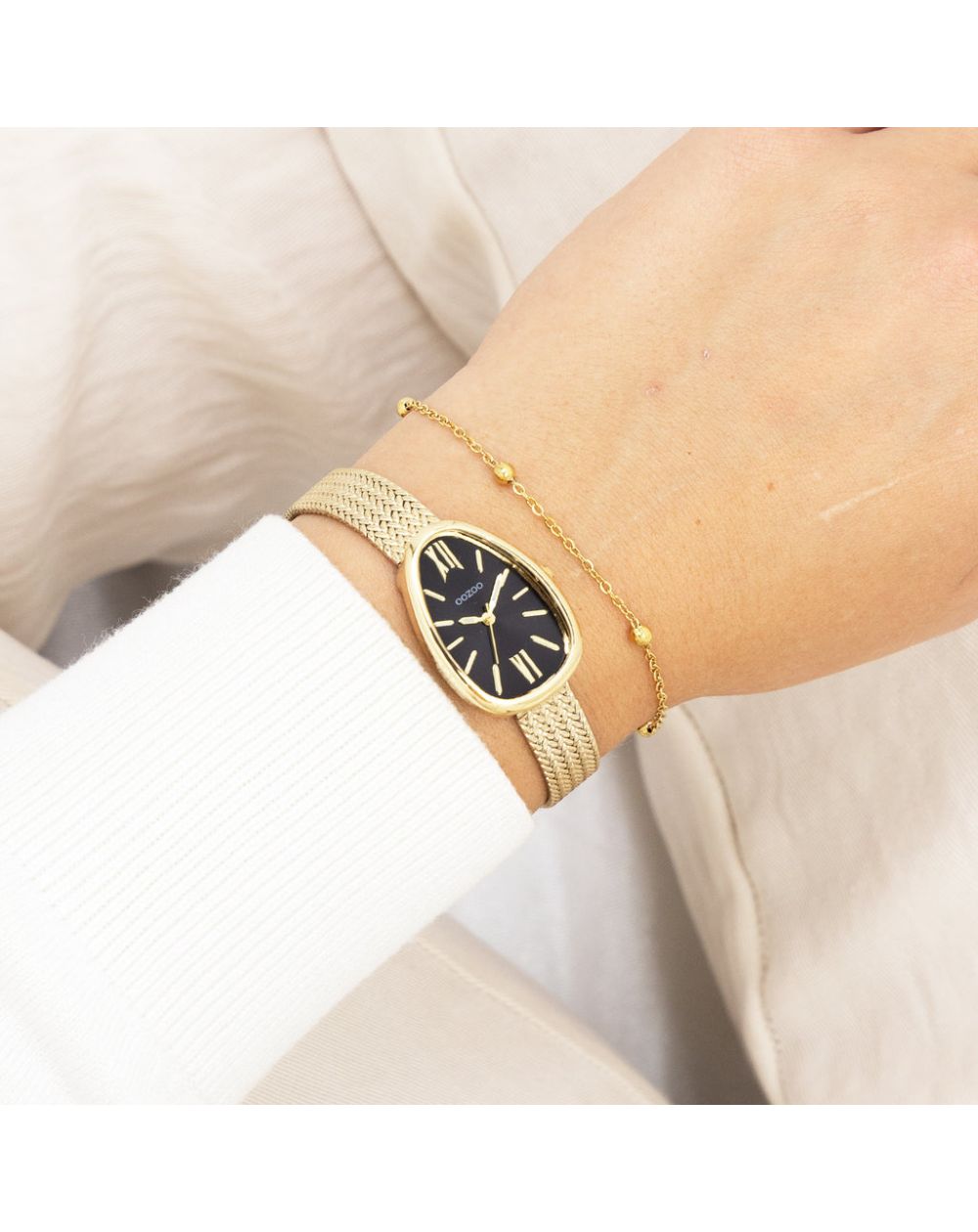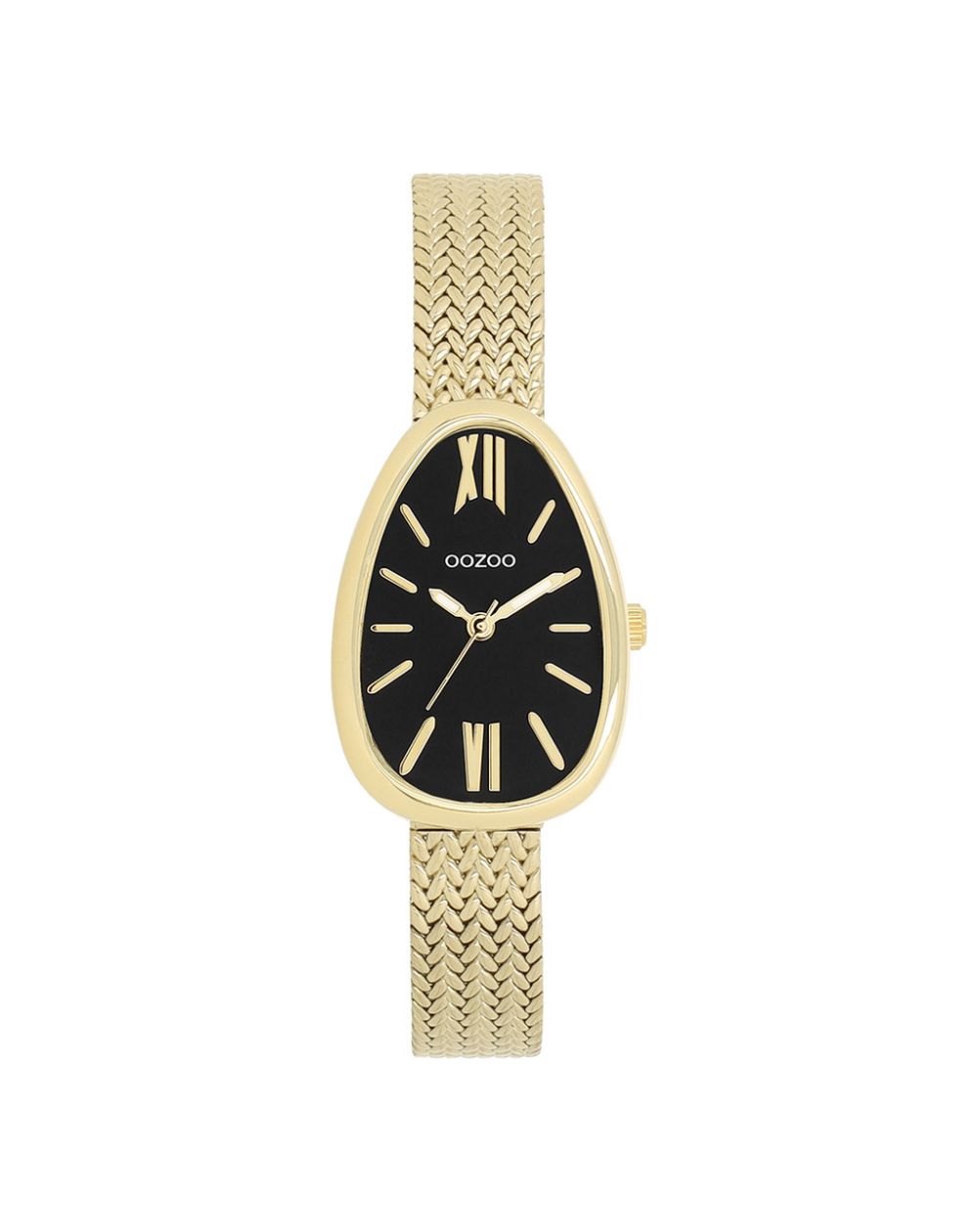 Kies voor elegantie met het ovale dameshorloge OOZOO C11643 , een verfijnd model uit de trendy OOZOO Timepieces-collectie. Het combineert een vergulde metalen kast van 31 x 22 mm met een elegante zwarte wijzerplaat, versierd met strepen en vergulde Romeinse cijfers met bijpassende wijzers.