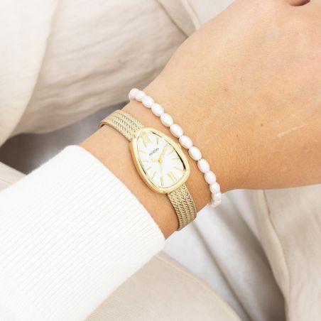 De dunne, goudkleurige metalen “V-mesh”-band biedt comfort en een moderne uitstraling, waardoor dit horloge een chique en onmisbaar accessoire is om elke dag te dragen.