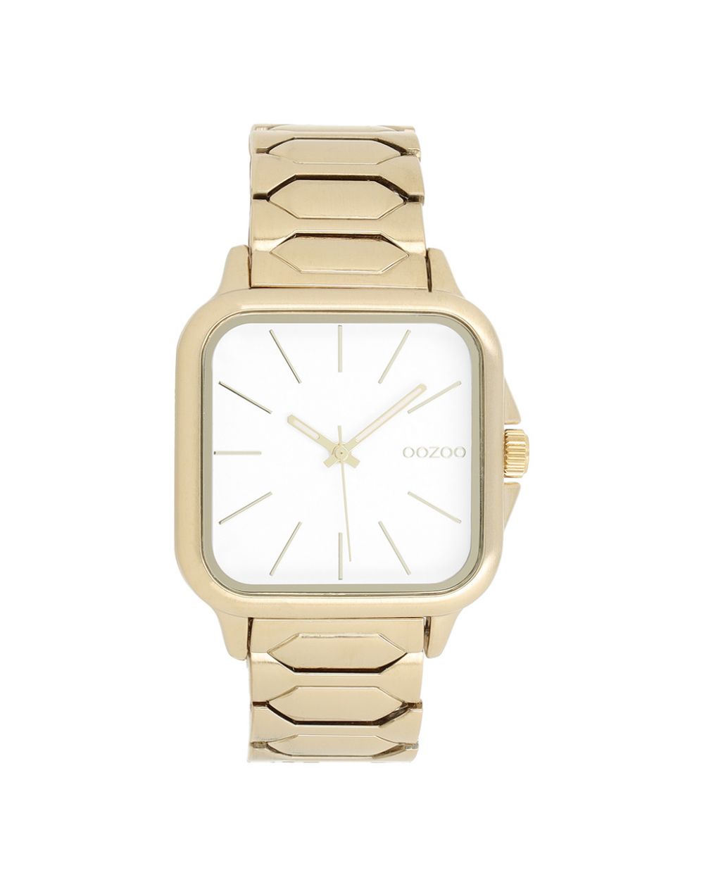 Laat je verfijnde stijl zien met het OOZOO C11605 unisex vierkante horloge, een trendy model uit de OOZOO Timepieces-collectie. Het heeft een 44 mm goudkleurige metalen kast en een strakke witte wijzerplaat, versierd met goudkleurige gestreepte indexen en bijpassende wijzers.