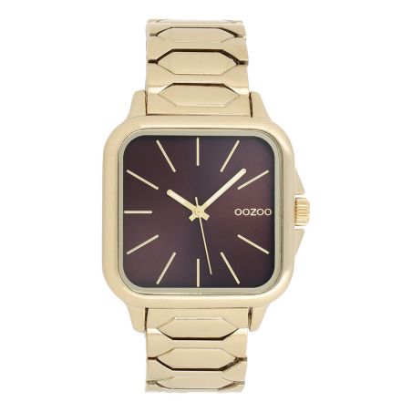 Maak een statement met het OOZOO C11607 unisex vierkante horloge, een trendy creatie uit de OOZOO Timepieces-collectie. Het heeft een vergulde metalen kast van 44 mm en een figrode sunburst wijzerplaat, geaccentueerd door goudgestreepte indexen en bijpassende wijzers.