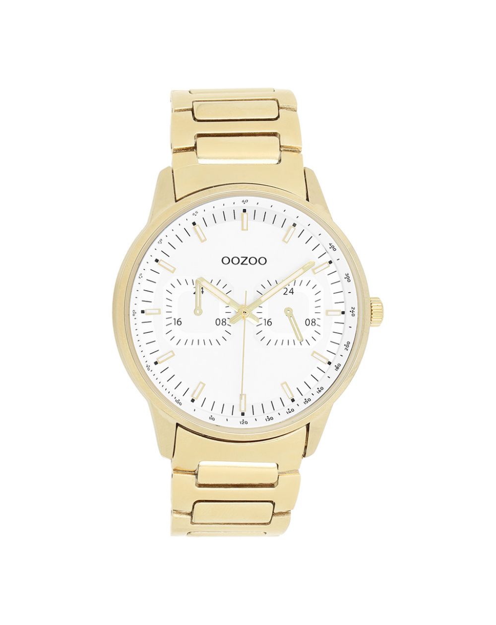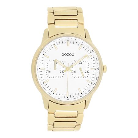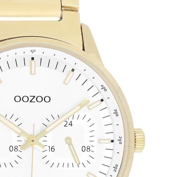 Omarm tijdloze elegantie met het ronde herenhorloge OOZOO C11623 , een verfijnd model uit de trendy OOZOO Timepieces-collectie. Het combineert een 42 mm goudkleurige metalen kast met een witte chronograafwijzerplaat, versierd met goud-witte indexen en bijpassende wijzers voor een chique en verfijnde look.