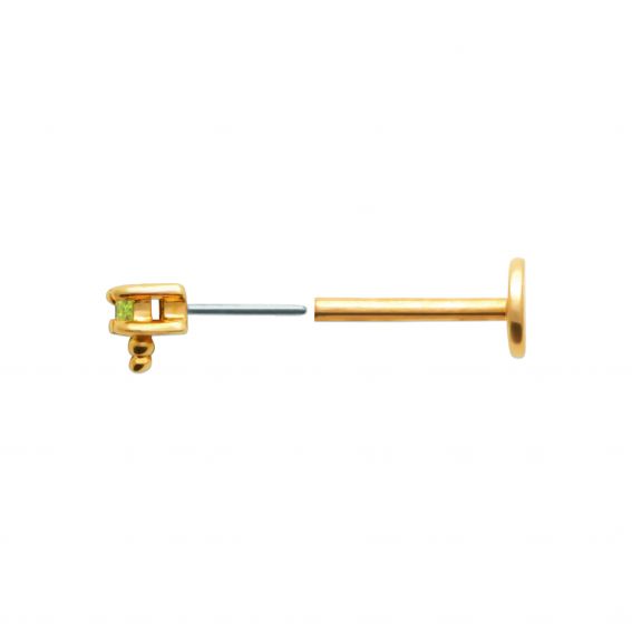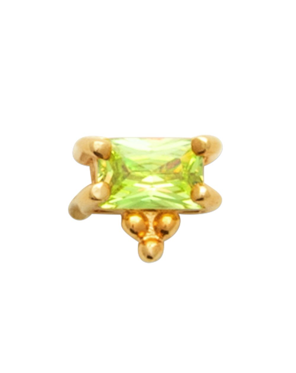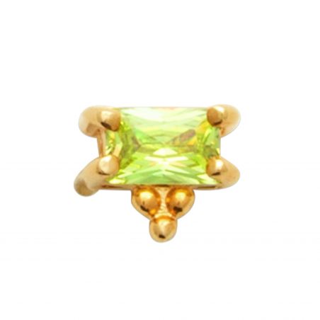 Laat je stijl stralen met deze piercing met pittige reflecties! Dit juweel is versierd met een rechthoekige, limoengroene steen met een schitterende glans en valt op door zijn originaliteit en gedurfde ontwerp. De klauwzetting is verguld met 18 karaat goud en voorzien van een klein pareldetail dat een subtiel, kostbaar tintje toevoegt. Hypoallergene titanium steel, ideaal voor comfortabel dragen.