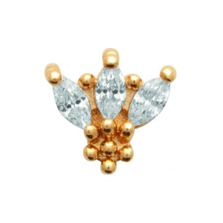 Deze piercing is een symbool van elegantie en gratie. De piercing doet denken aan een klein bloemenkroontje dat bestaat uit drie marquise-geslepen kristallen, fraai gezet op een parelmoeren gouden basis. Het geheel vormt een delicaat en lichtgevend patroon, ideaal om de oorlel of het kraakbeen verfijnd te accentueren. De armband is gemonteerd op een hypoallergene titanium steel en is daardoor zacht om te dragen en prachtig om naar te kijken.