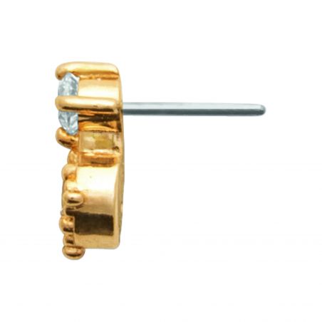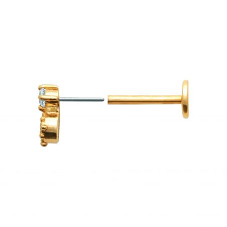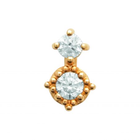 Deze prachtige piercing combineert twee sprankelende witte kristallen in een delicaat verticaal ontwerp. Het bovenste kristal, bezet met drie pootjes, rust op een tweede, groter kristal, omringd met gouden parels. Een verfijnde en lichtgevende creatie die de lijn van het oor op elegante wijze verlengt. Optimaal comfort gegarandeerd dankzij de chirurgische titanium staaf.