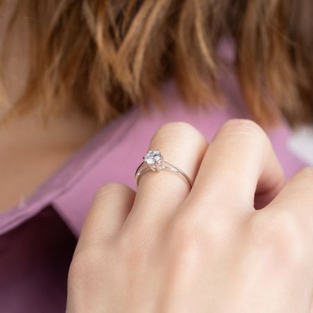 De rondgeslepen steen, gezet op een dunne, delicate band, vangt het licht vanuit elke hoek op voor een schitterend en verfijnd effect. Het strakke ontwerp laat de solitaire diamant, een symbool van liefde en verbondenheid, perfect tot zijn recht komen.