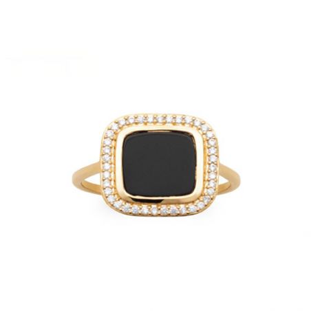 Deze hoogwaardige 18 karaats vergulde ring is een damesring met een zeer mooie vierkante zwarte agaat schijf van 13 mm aan een zijkant, deze is rondom bezet met zirkoniumoxide stenen.