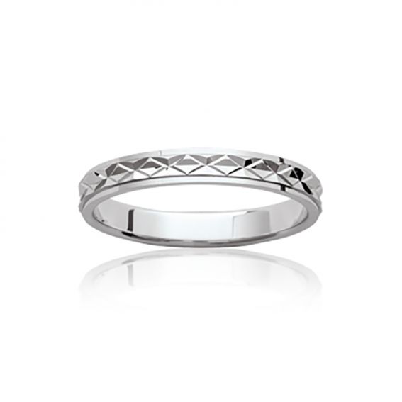 Deze uniseks trouwring is 3 mm breed en is gemaakt van gerhodineerd 925 zilver en biedt eenvoudige, moderne elegantie. Het onderscheidende ontwerp is voorzien van een kriskras patroon dat een vleugje verfijning toevoegt en toch ingetogen blijft.