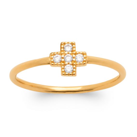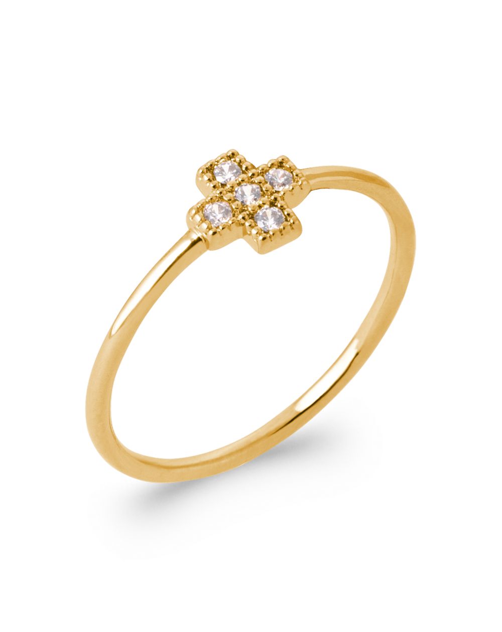 Minimalistisch en stralend, deze fijne vergulde ring is versierd met een kruis met vier pootjes, bezet met witte zirkonen . Het slanke, verfijnde ontwerp maakt hem ideaal om alleen te dragen voor een delicate look of om te combineren met andere ringen.