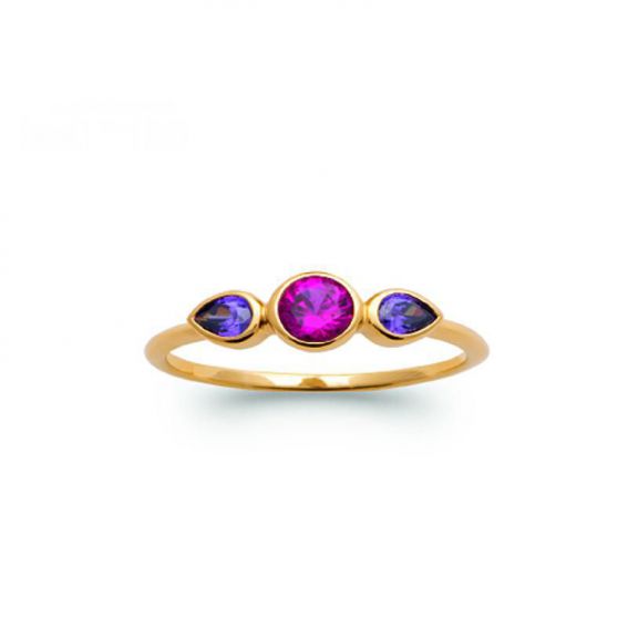 Vergulde ring bestaande uit 3 paarse stenen waarvan u uw maat kunt kiezen.