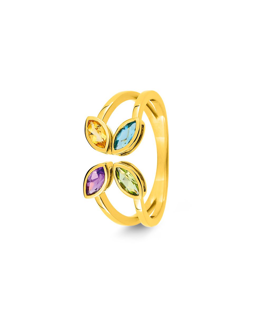 Amethist, peridoot, aquamarijn en topaas bloemenring in 9 karaat geelgoud