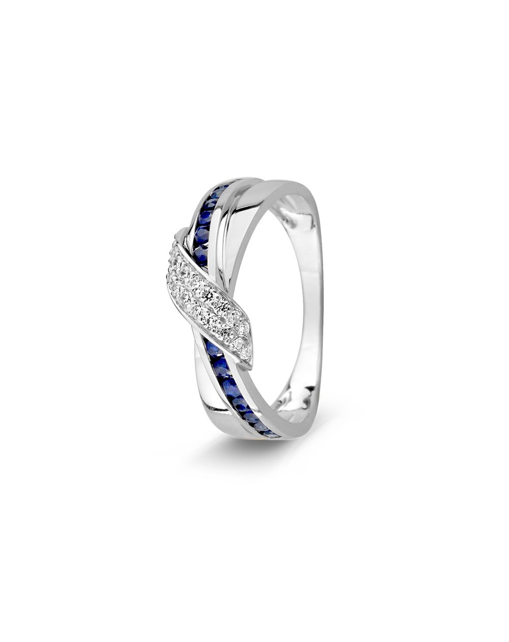 Deze witgoudenring met 9 carat is een ring met saffieren en zirkoniumoxidestenen. Dit kan van binnen worden gegraveerd.