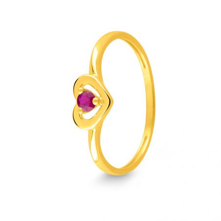 Deze 9 karaat gele goudring is een hartvormige ring met een robijn. Dit kan van binnen worden gegraveerd.