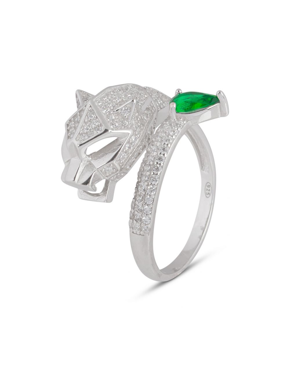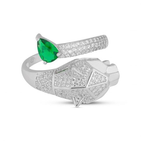 Deze 925 zilveren ring is een pantervormige ring gezet met een smaragd kleurige steen.