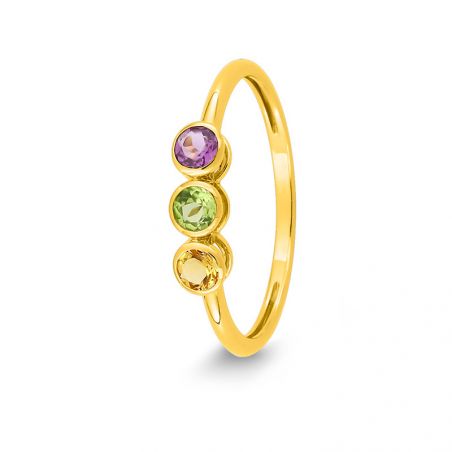 Deze 9 karaat geelgouden ring is een ring met 3 stenen citrien, peridoot en topaas. Dit kan aan de binnenkant gegraveerd worden.