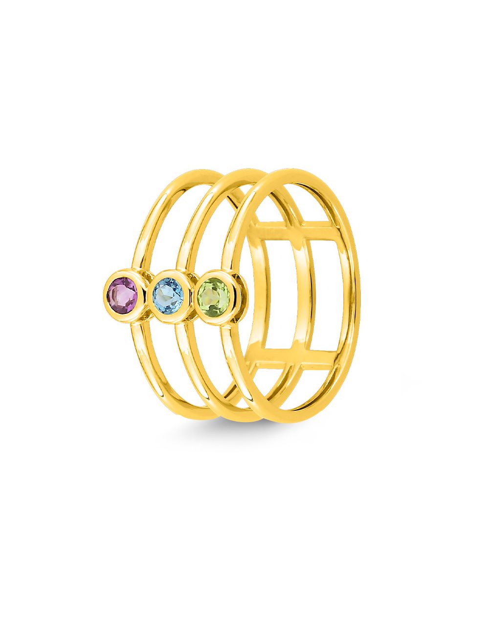 Deze 9 karaat geelgouden ring is een drierijige ring met 3 stenen: topaas, amethist en peridoot. Dit kan aan de binnenkant gegraveerd worden.