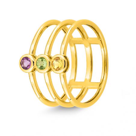 Deze 9 karaat geelgouden ring is een drierijige ring met 3 stenen amethist, topaas en peridoot. Dit kan aan de binnenkant gegraveerd worden.