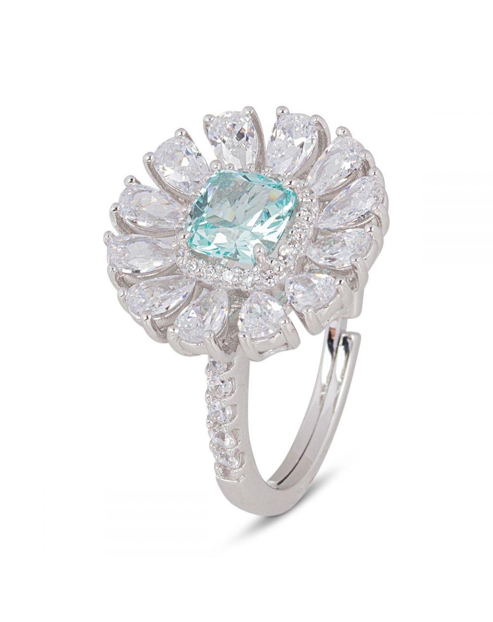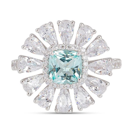 Deze 925 zilveren ring is een grote bloemvormige ring bezet met zirkoniumoxide stenen.